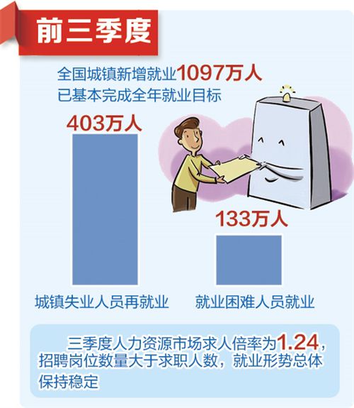 据人力资源社会保障部数据显示,前三季度,全国城镇新增就业1097万人,已基本完成全年就业目标;城镇失业人员再就业403万人,就业困难人员就业133万人,均保持较高水平。三季度人力资源市场求人倍率为1.24,招聘岗位数量大于求职人数,就业形势总体保持稳定。