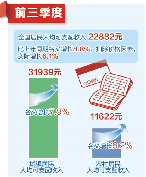 居民收入增长平稳,与经济增长基本同步。前三季度,全国居民人均可支配收入22882元,比上年同期名义增长8.8%;扣除价格因素,实际增长6.1%。居民人均可支配收入实际增速与GDP增长基本同步,快于人均GDP增长。