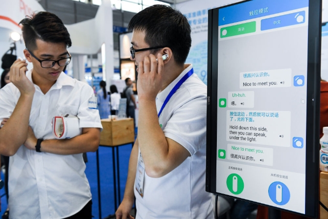 2018年11月16日,在深圳举行的第20届高交会上,来自深圳的年轻创客(右)向参观者介绍团队研发的同声传译耳机。新华社记者 毛思倩/摄