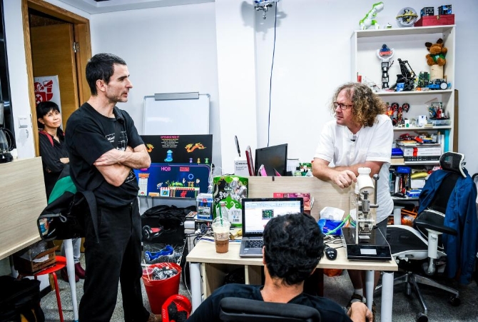 在深圳市福田区华强北一个创客孵化器内,来自荷兰阿姆斯特丹的卫国(右一)与来自不同国家的创客交流(2018年10月25日摄)。新华社记者 毛思倩/摄