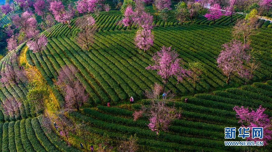 这是日出时分的云南南涧彝族自治县无量山樱花谷一景(12月11日无人机拍摄)。近日,位于云南省南涧彝族自治县的无量山樱花谷迎来最佳观赏期,如云似霞的樱花与碧绿如染的茶园交织在一起,构成了一道亮丽的风景。新华社记者胡超 摄