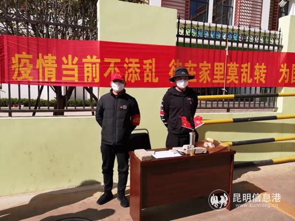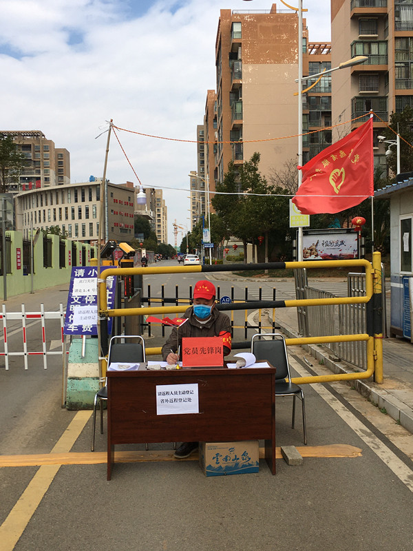 疫情阻击战打响后,每天早晨,在呈贡区吴家营街道中庄社区沐春园小区的入口检查站,每辆车和每个人都依次在道闸前等候检查。