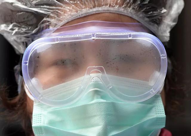 2月10日,从辖区返回德望社区居委会的工作人员护目镜上已起雾。新华社记者李贺摄