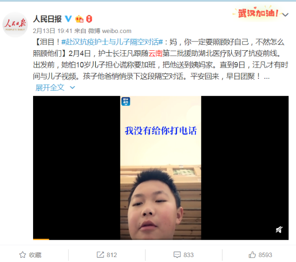 2月13日,人民日报微博报道,云南第二批援助湖北医疗队护士长汪凡与儿子隔空对话的感人故事。