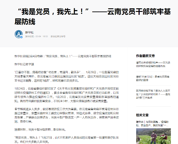 2月4日,新华社刊登《“我是党员,我先上!”——云南党员干部筑牢基层防线》一文,记录艰难时刻,云南党员干部冲锋在前,彰显担当。
