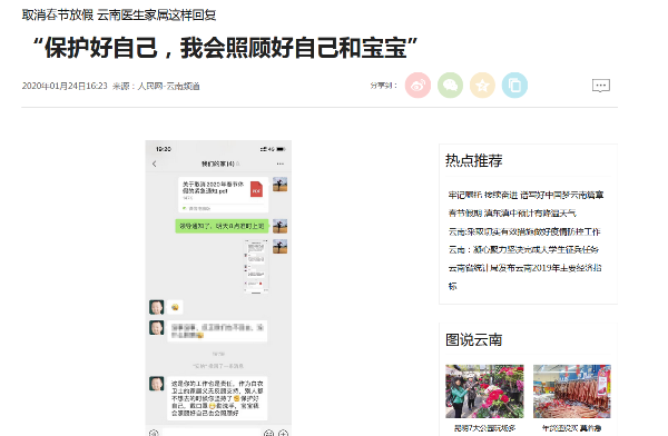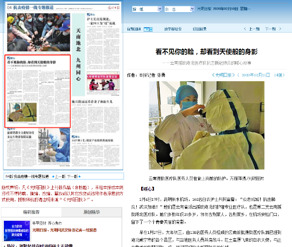 2月10日,光明日报刊登《看不见你的脸,却看到天使般的身影——云南援助湖北医疗队抗击新冠肺炎的暖心故事》文章,记录了云南第二支援助湖北医疗队出征时,队员匆匆告别家人,告别家乡,在机场安检门口,留下了一个个青春美丽的背影。