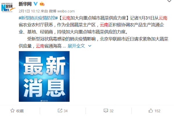 2月1日,新华网报道,作为全国蔬菜的主产区,云南积极协调农产品生产流通企业、基地、经销商,持续加大向重点城市蔬菜供应力度。