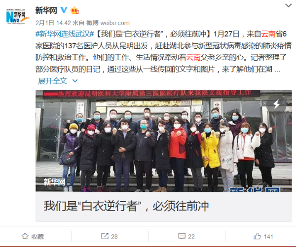 2月1日,新华网报道,1月27日,来自云南省6家医院的137名医护人员从昆明出发,赶赴湖北参与新型冠状病毒感染的肺炎疫情防控和救治工作。