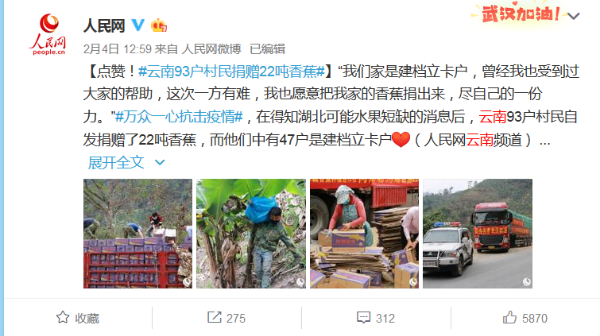 2月4日,人民网报道,云南93户村民捐赠了22吨香蕉。