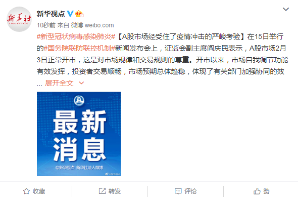 在15日举行的国务院联防联控机制新闻发布会上,证监会副主席阎庆民表示,A股市场2月3日正常开市,这是对市场规律和交易规则的尊重。开市以来,市场自我调节功能有效发挥,投资者交易顺畅,市场预期总体趋稳,体现了有关部门加强协同的效果。A股市场经受住了疫情冲击的严峻考验,目前市场已基本回归常态化运行。(记者刘慧)