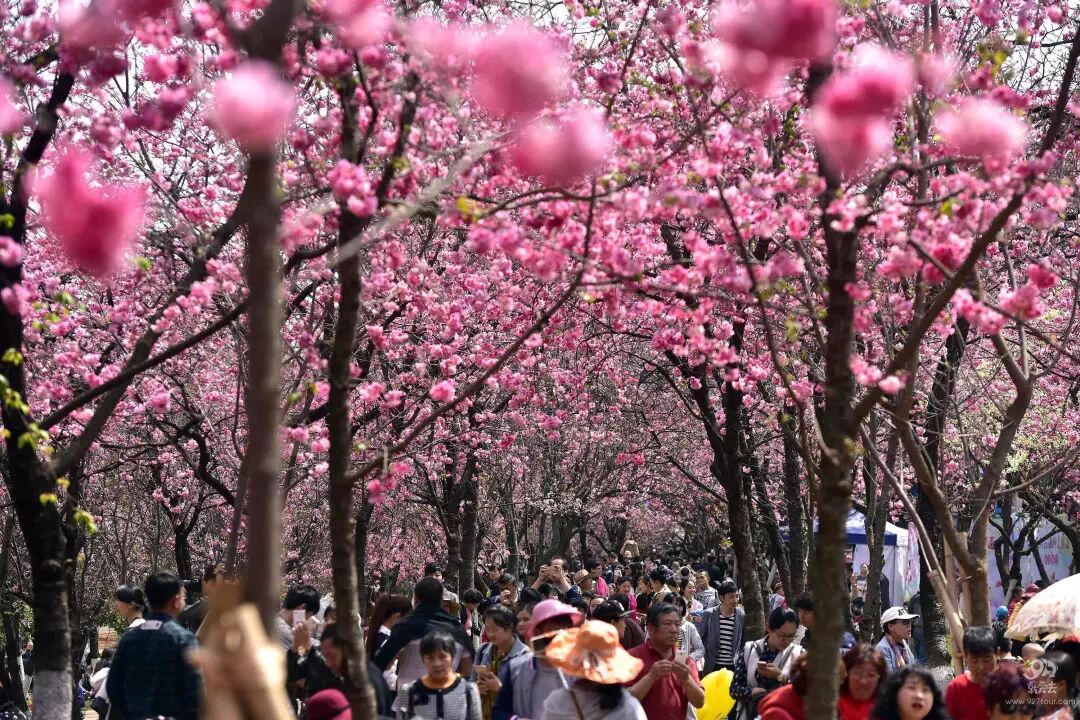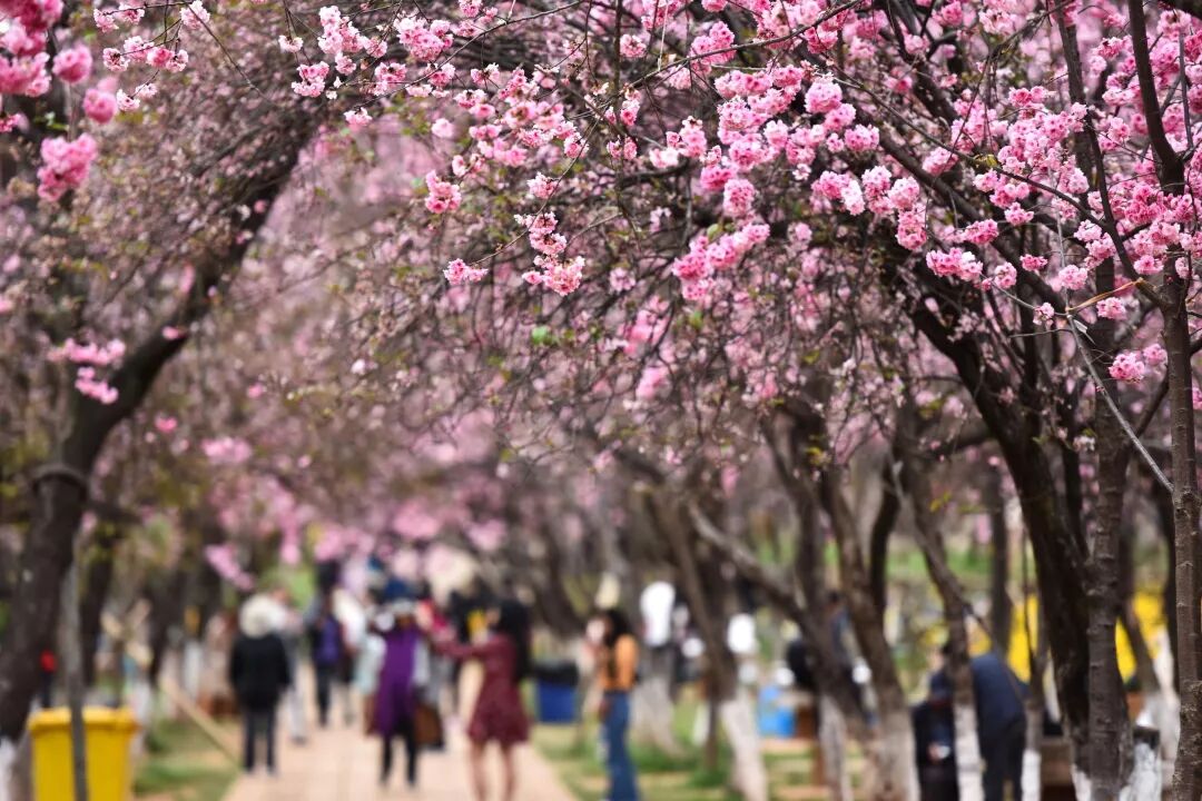 到圆通山赏樱,樱花沿路绽放,数千株云南樱花、日本樱花和垂丝海棠竞相开放,构成一片上万平方米的花海,粉的、红的、白的花朵相互交映,甚是赏心悦目。