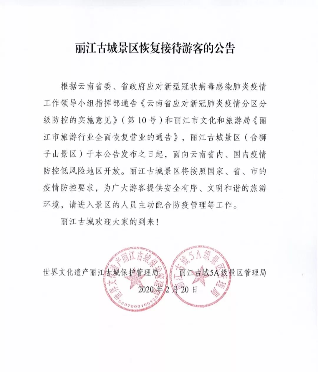 2月20日,丽江市文化旅游局发出《丽江市旅游行业全面恢复营业的通告》。通告指出,“从今日起,丽江将面向云南省内、国内疫情防控低风险地区开放,全市旅游行业全面恢复营业”。