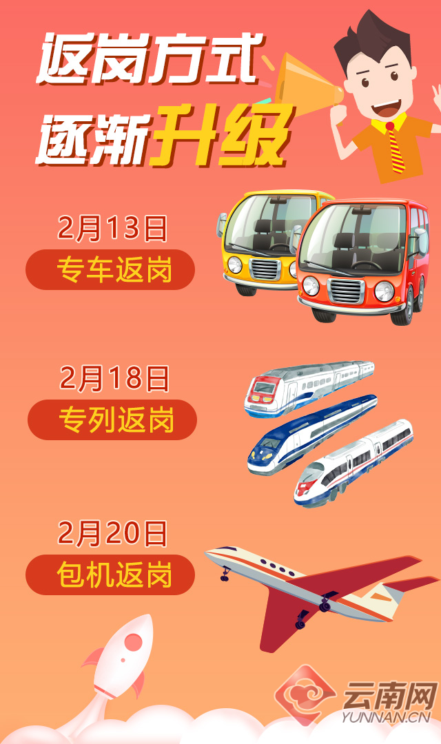 优化运力配置和调度,统筹协调国有运输骨干企业勇挑大梁,加大运力投入,开通“返岗直通车”,开展复工企业人员道路客运包车。(记者 李海球 云南网编辑范春艳 乐诚弘韵 王胤整理 制图 王元)