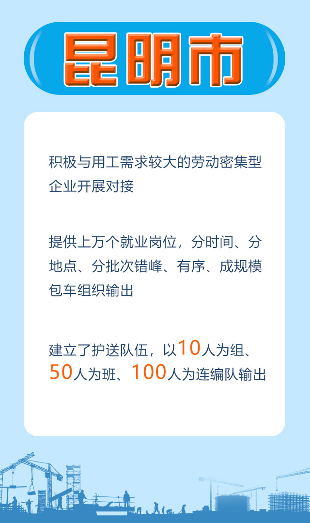 昆明市人社部门采取提升组织化程度,有序组织昆明籍务工人员分批次外出就业,积极与用工需求较大的津京冀、长三角、珠三角等地100多个市场前景好的劳动密集型企业开展对接,提供上万个就业岗位,分时间、分地点、分批次错峰、有序、成规模包车组织输出。并建立了护送队伍,成立乡镇(街道)分管领导为护送队长,劳动保障服务中心主任为护送队员的护送队伍,以10人为组、50人为班、100人为连编队输出。截至2月22日,全市农村劳动力返岗及转移就业192354人,其中省外6189人;有组织转移44747人。