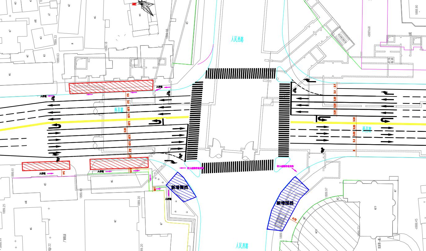 围挡调整期间,为保证行人和车辆通行,将对西昌路与人民西路交叉口北口的机动车道掉头点向北移动约20米,缓解车辆掉头通行压力。云大医院门前最左侧掉头车道与相邻直行车道的虚线分割线调整为实线,并在云大医院门口设置相应的指示、提示牌,禁止由云大医院驶出车辆连续变道进入掉头车道,进而缓解该段交通压力。