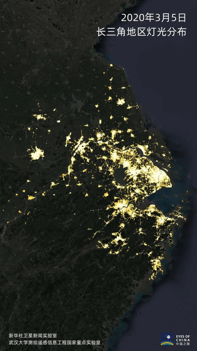 这是长三角地区3月5日较2月初,夜间灯光亮度增加情况,黄色越明亮,亮度增加越多
