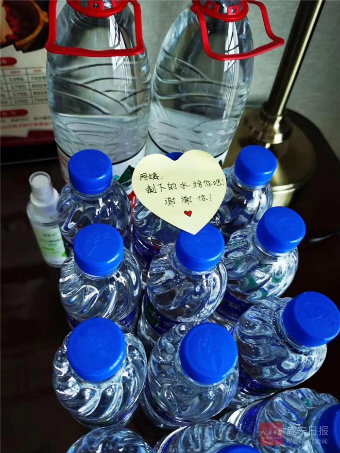 一位队员留下了十多瓶矿泉水,并写道:阿姨,剩下的水,给你吧,谢谢你!