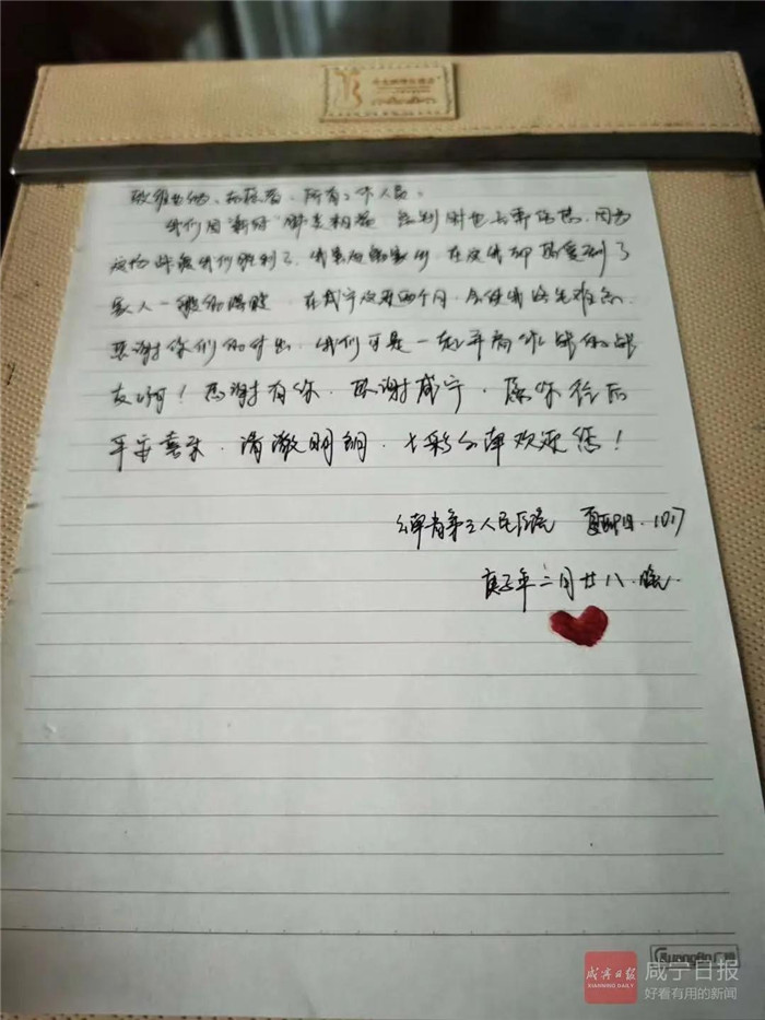 医疗队队员夏亚阳给维也纳志愿者、所有工作人员留下一封信:我们因新冠肺炎相遇,离别时也无需伤感。因为这场战疫我们胜利了。我虽远离家乡,在这里却感受到了家人一般的温暖。在咸宁这近两个月,会使我终生难忘,感谢你们的付出,我们科室一起并肩作战的战友啊!感谢有你,感谢咸宁,愿往后平安喜乐、清澈明朗,七彩云南欢迎您!