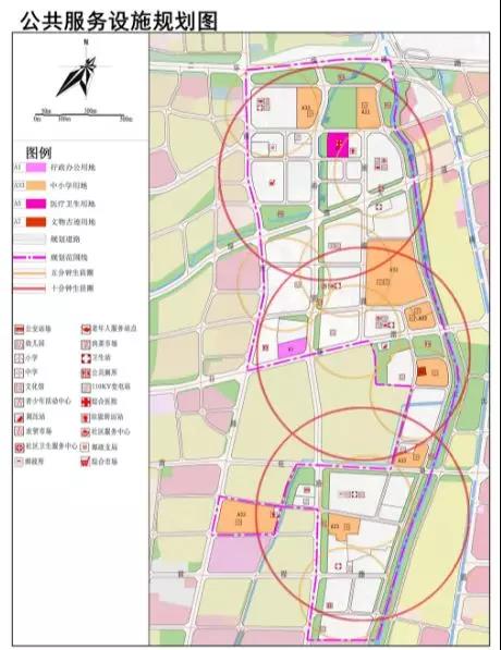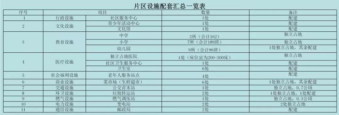 规划形成3处社区服务中心、1处青少年活动中心、1处文化馆,独立占地医院1处,社区卫生服务中心1处,卫生室6处,老年人服务站点4处,菜市场6处,公交首末站1处,垃圾转运站2处,燃气调压站1处,变电站2处,邮政局2处,具体详见下表: