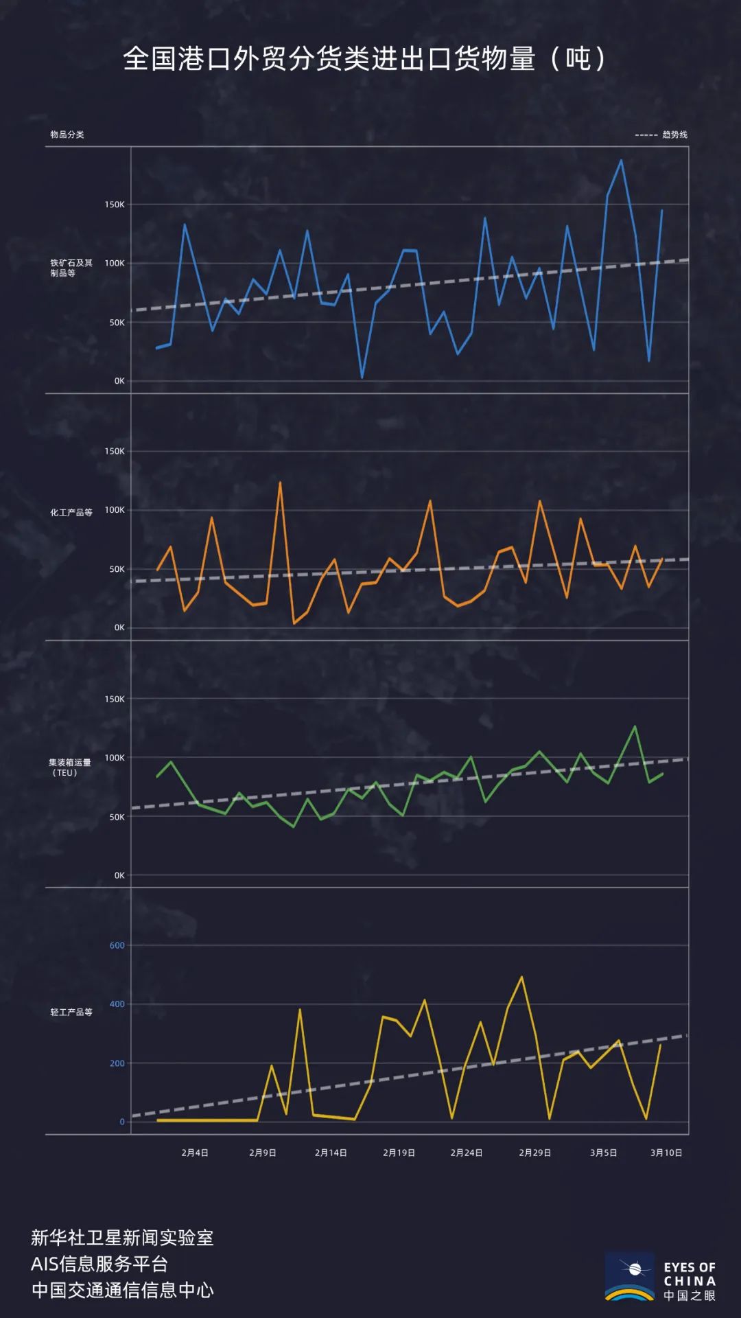 中国主要出口货物种类的总量大多在回升,铁矿石及其制品、化工产品以及轻工产品等的进出口量增加更为明显。