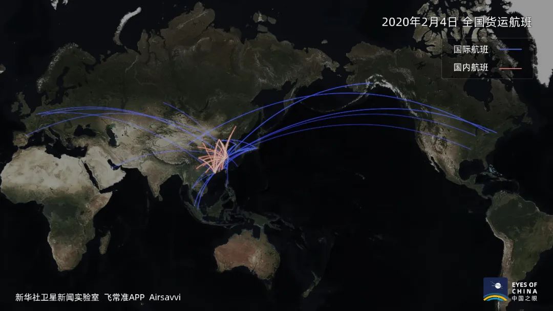 1个月内,中国国内和直飞世界各地的货运航班快速增多,原有航线航班数也有增加,标示航线的橘色、蓝色线条也就更粗。