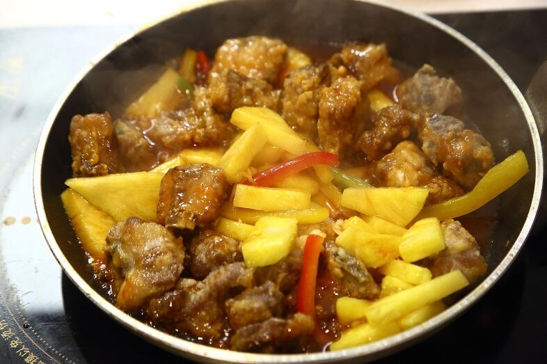 目前正值菠萝成熟期,除了作为水果,还在岭南菜式里也多有入菜。因为菠萝性味甘平、口感清新,能让菜式在咸甜的碰撞中取得平衡,还具有健胃消食的效果,对于经常食肉和油腻食物的人有助消化。