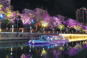 19点30分,首班盘龙江夜航游船缓缓驶出桃源广场中心码头。远处,是万家灯火和一栋栋经过亮化、美化的高楼大厦,组成了灯火辉煌、美轮美奂的春城夜景;近处,盘龙江沿岸的暖色灯带和造型优美的沿江灯具以及一座座桥梁上不断变化着色彩的灯光小品,都与嵌满彩色灯珠的游船相映生辉。船上的游客以及沿岸的行人纷纷拿起手机、相机拍摄这一“新”景观。