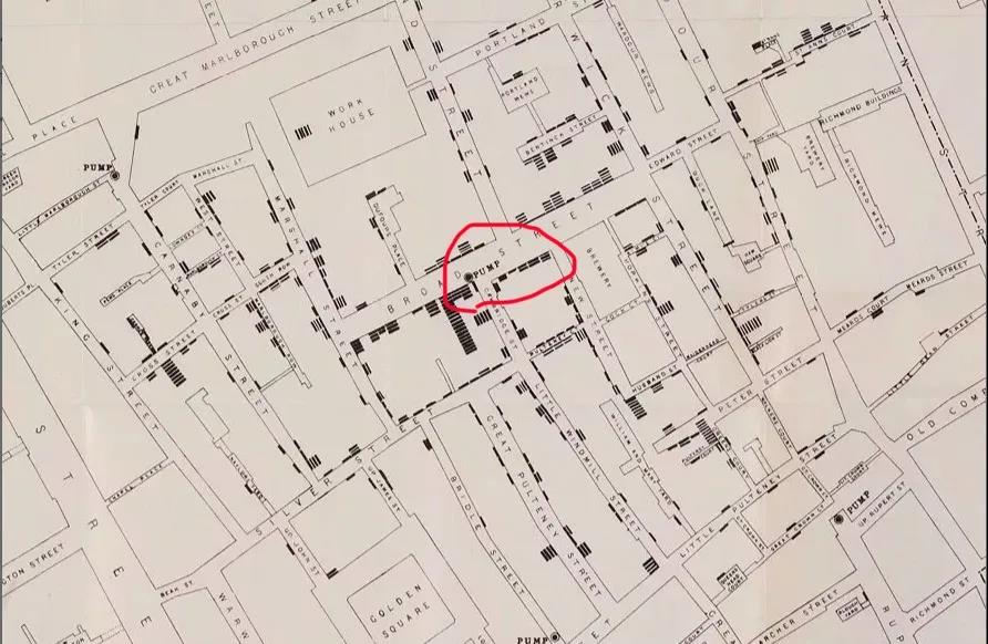 斯诺则通过一系列的调查,逐步将目标聚焦到水源上。他根据霍乱死亡病人的资料画了一个统计地图,通过比对发现一个水井周围的居民,发病率显著高于伦敦市其他地区。