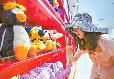 7月1日,海口日月广场免税店内,顾客正在选购毛绒玩具。康登淋摄(人民视觉)