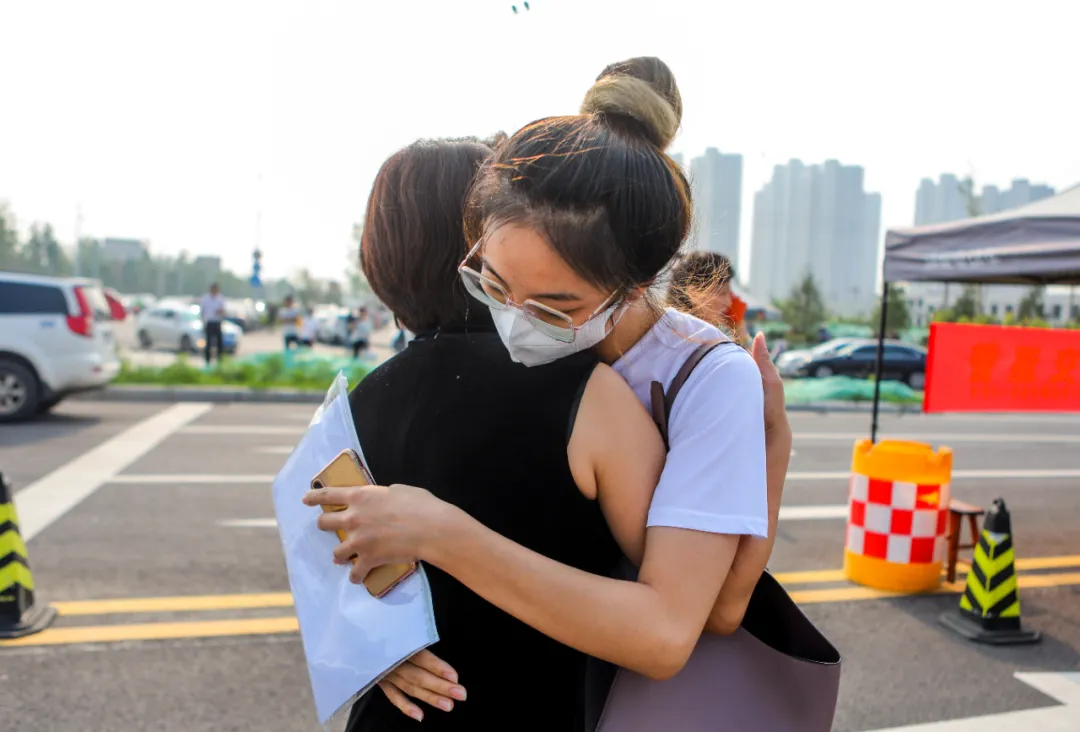 7月7日,在河北省邯郸市邯山区第一中学考点,考生在入场前与母亲拥抱。新华社记者 王晓 摄