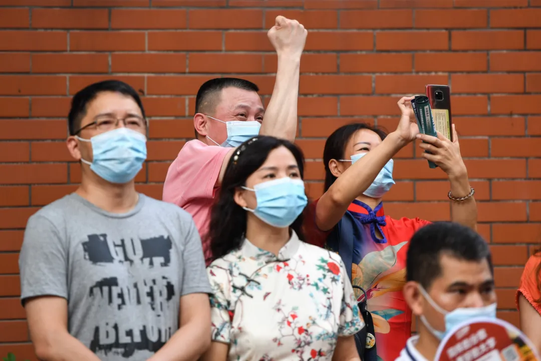 7月7日,在广州市第七中学考点外,送考家长为考生鼓劲。新华社记者 刘大伟 摄