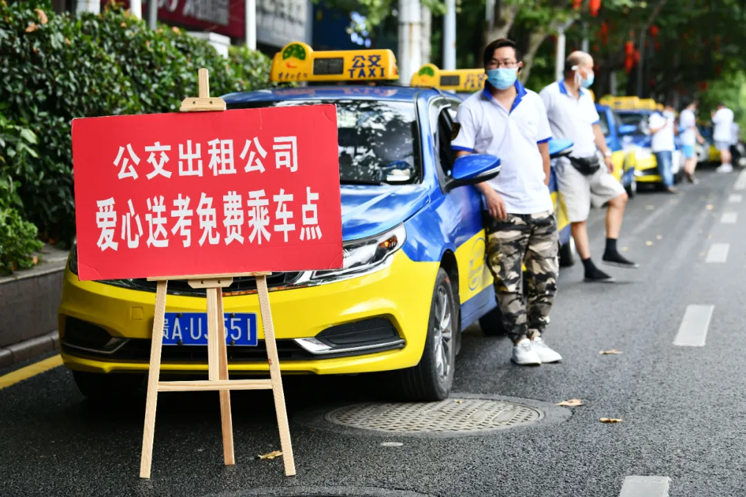7月7日,在贵州省贵阳市第六中学考点外,爱心送考出租车司机在等候考生结束考试后免费乘车。新华社记者 杨文斌 摄