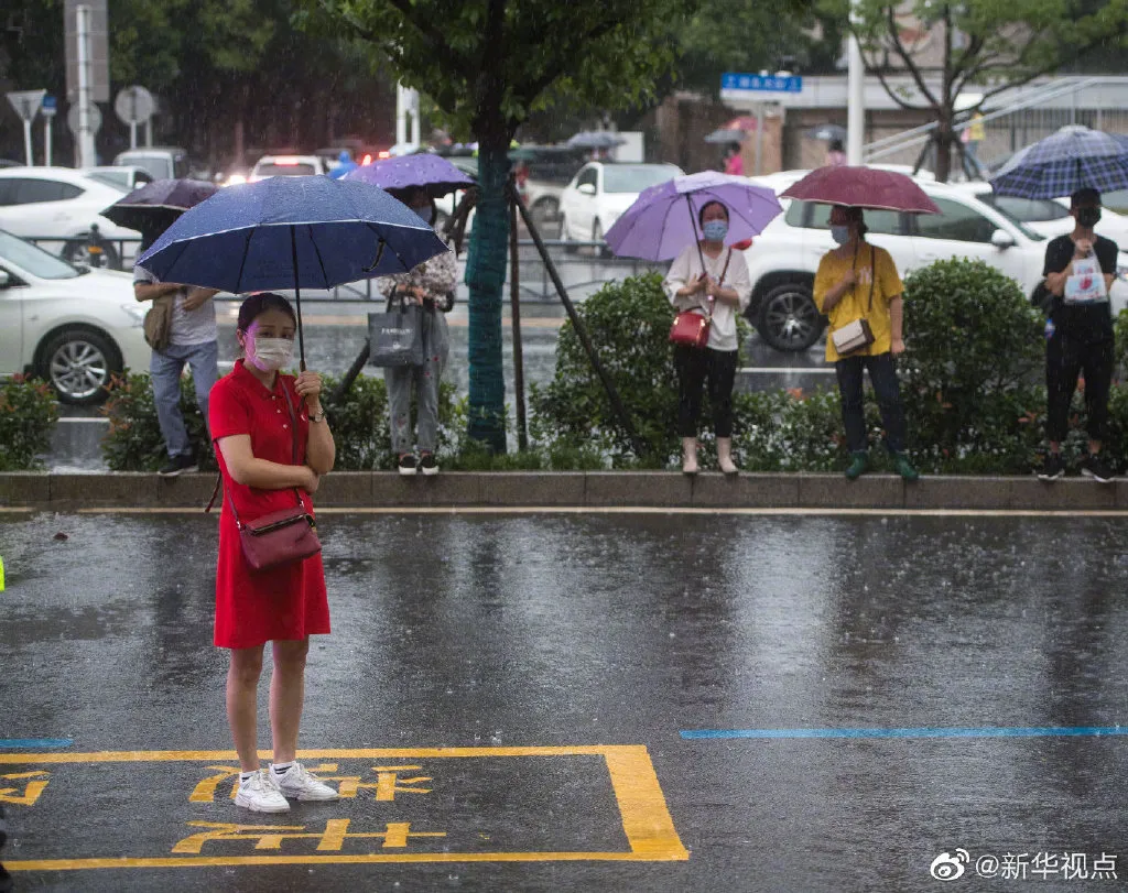 今天,2020年高考拉开帷幕。武汉降下大雨,考生家长等候在武汉东湖中学考点外。新华社记者 肖艺九 摄