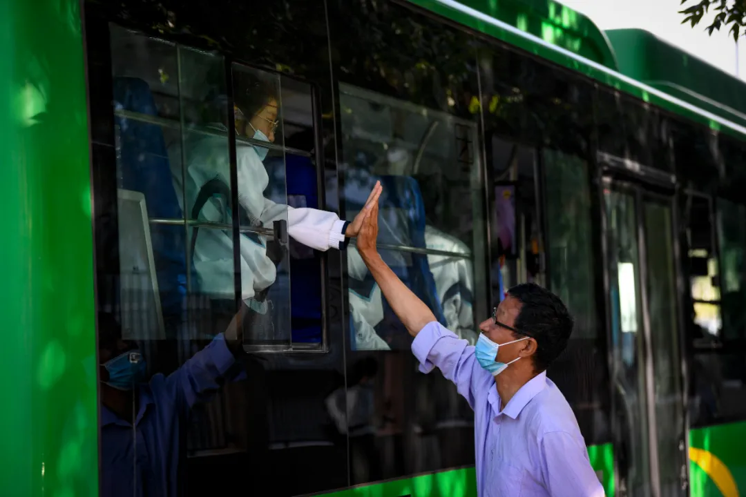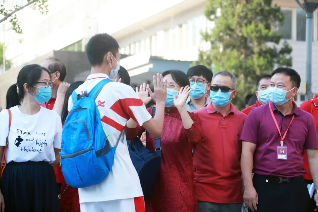 7月7日,在宁夏六盘山高级中学,教师(右)为乘专车前往考点的学生加油鼓劲。新华社记者 冯开华 摄