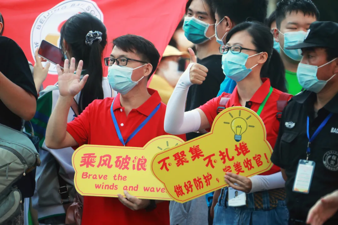 7月7日,送考老师在北京市人大附中考点外为考生加油。新华社记者 卢烨 摄