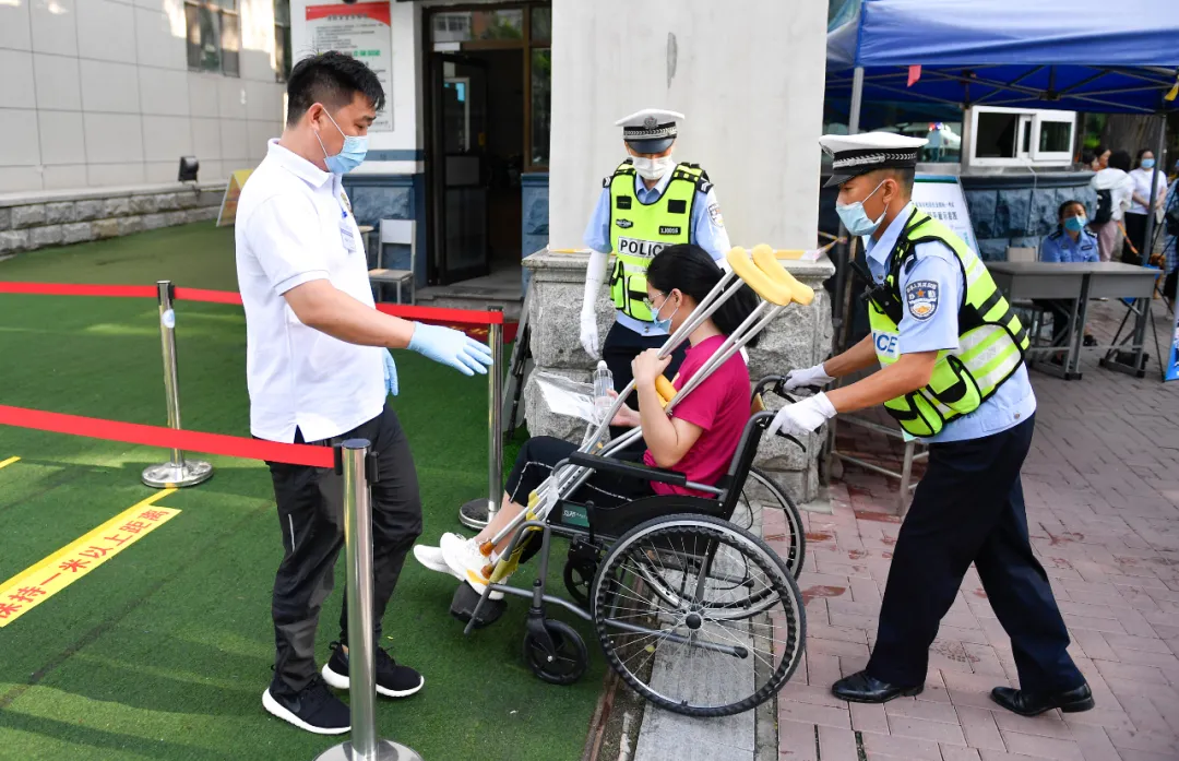 7月7日,在吉林省长春市的东北师范大学附属中学考点,工作人员帮助推行一名行动不便的考生进入考场。新华社记者 许畅 摄