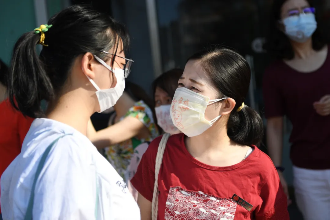 7月7日,在北京市门头沟区大峪中学考点外,送考老师(右)在考生进入考点前与考生交流。新华社记者 鞠焕宗 摄