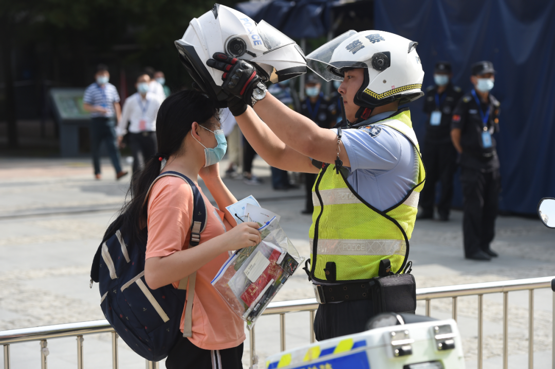 7月7日,在安徽省合肥市五十中学天鹅湖校区考点,交警将快要迟到的考生送到考场。新华社记者 周牧 摄