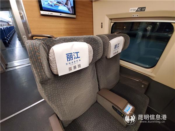 “丽江文化旅游列车”以“柔软时光,休闲丽江”为主题,把古城、玉龙雪山、泸沽湖、老君山等丽江最具代表性的自然、人文景观融入列车小桌板、行李架以及各个展板,让人如同置身于丽江山水之间,成为展示丽江旅游景点、旅游产品及丽江民族文化的“移动新名片”。