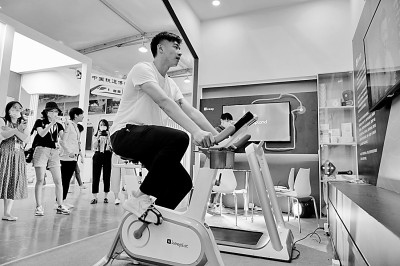 9月3日,一名记者在2020服贸会文化体育融合展区体验智能健身设备。新华社发