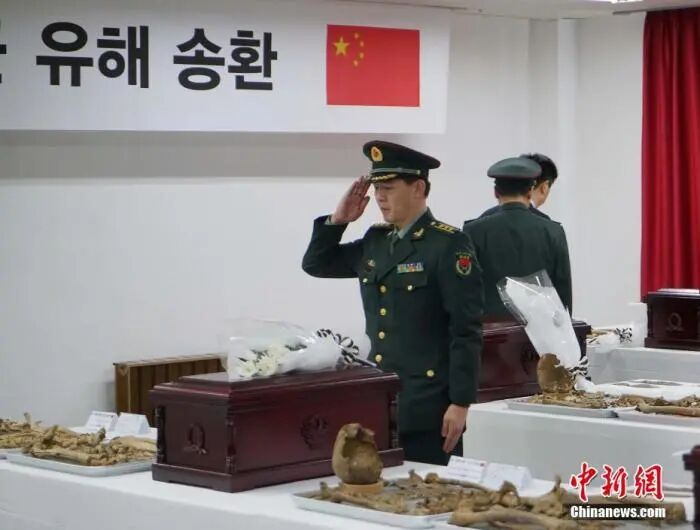 资料图:2019年4月1日,中韩在韩国仁川举行第六批在韩中国人民志愿军烈士遗骸装殓仪式。中方代表现场进行了默哀、献花等悼念活动。中新社记者 曾鼐 摄