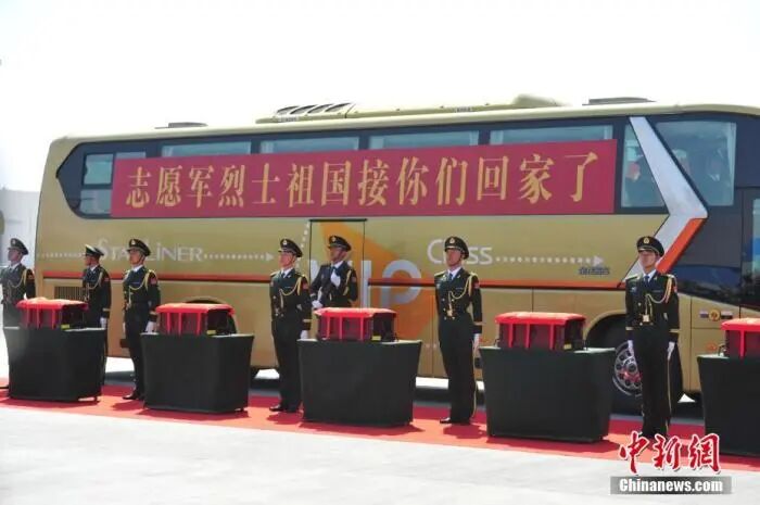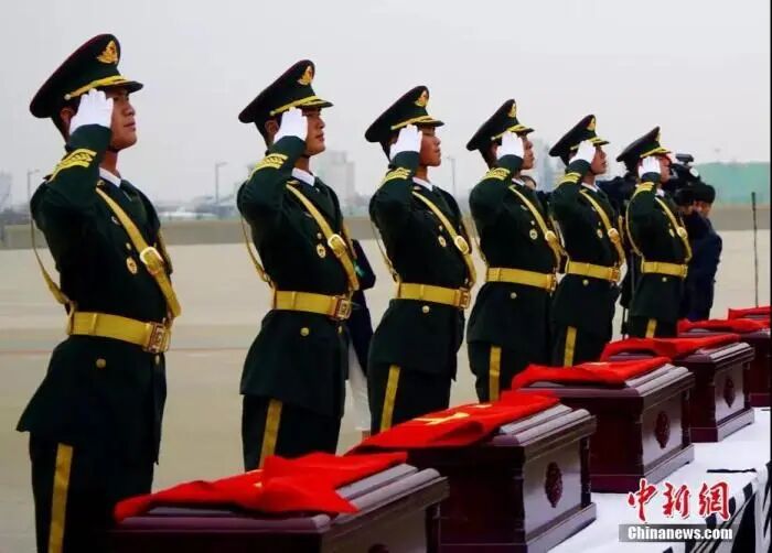 资料图:2019年4月3日,10具在韩中国人民志愿军烈士遗骸由中国人民解放军空军专机接运回国,抵达沈阳桃仙国际机场。中新社 记者于海洋/摄