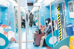 10月2日晚10点,四川游客周琦一家5口飞抵昆明长水国际机场,不需要出航站楼,他们很快就找到了转乘地铁6号线的站厅。周琦还惊喜地发现,他们搭乘的是6号线独有的“孔雀云南飞”主题列车。车厢内以青蓝色为主色调,除了两只华美的孔雀“坐镇”,还有昆明长水国际机场、昆明国际会展中心、蓝花楹等昆明地标和文化元素,云南山茶花、展翅飞翔的红嘴鸥等视觉符号交错排列,让周琦一家感叹不已。