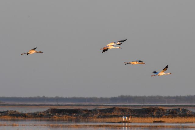 10月19日,在位于吉林省白城市镇赉县的莫莫格国家级自然保护区,几只白鹤从湿地上空飞过。