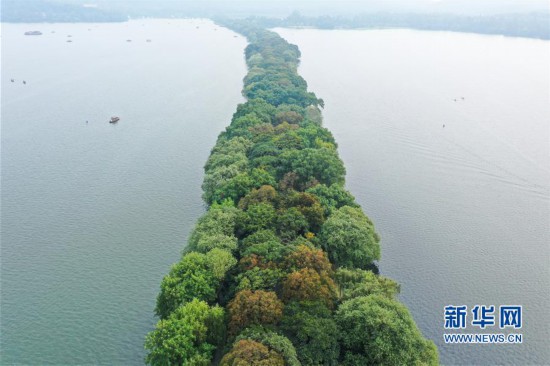 10月22日,机动车在西湖杨公堤上行驶(无人机照片)。 近日,随着气温降低,杭州西湖初露秋色,显出迷人风韵。 新华社记者 翁忻旸 摄