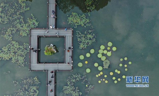 10月22日,游人在西湖小瀛洲岛游玩(无人机照片)。 近日,随着气温降低,杭州西湖初露秋色,显出迷人风韵。 新华社记者 翁忻旸 摄