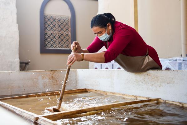 11月1日,在墨玉县普恰克其乡布达村的一个桑皮纸作坊里,匠人用木棍不断搅拌模具里的纸浆使其均匀。