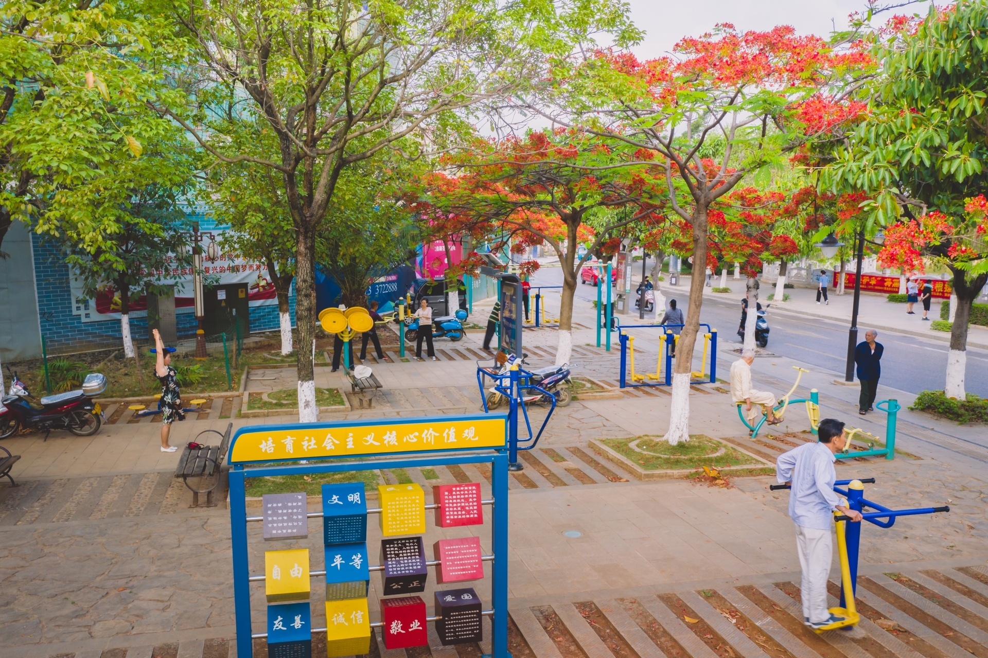 能感受到凤凰路的美,应该是住在这条路上的居民最有深切的感受,每天清晨,位于红河商城前面的健身器材场地总是非常热闹,出来晨练的市民都喜欢在这里锻炼身体,伸伸腿,拉拉腰、活动活动筋骨。