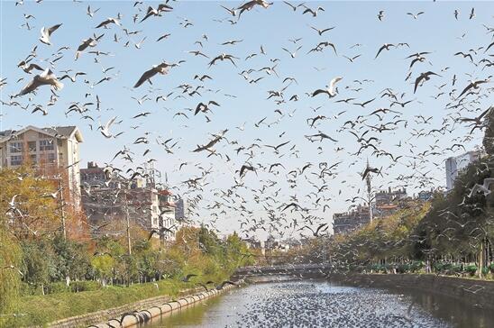 昆明市林业和草原局与昆明鸟类协会公布的统计数据显示,今年来昆越冬的红嘴鸥数量达4.16万只,较往年略有增长,创历年来昆越冬红嘴鸥数量之最。图为昆明船房河道上空万只红嘴鸥飞舞,如漫天飞雪般壮观。(云南日报 记者杨峥/摄)