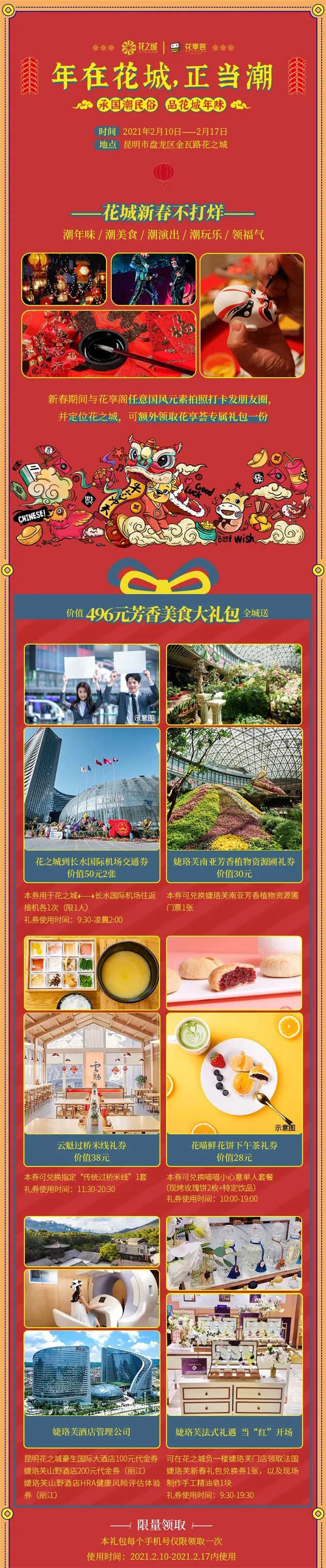 年在花城,正当潮,乘国潮民俗,品花城年味。2月10日至2月17日,昆明花之城新春不打烊,届时,花之城将带给你浓浓的潮年味、潮美食、潮演出、潮玩乐,还能领福气。春节期间与花享阁任意国风元素拍照打卡发朋友圈,并定位花之城,可额外领取花享荟价值496元芳香美食大礼包一份。